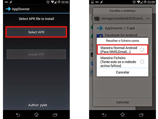 Step 3 Open AppDowner and tap "Select APK". In the next window, choose the downloaded installer and select option "Normal Android Way". Choose "File Way" is the first solution fails;